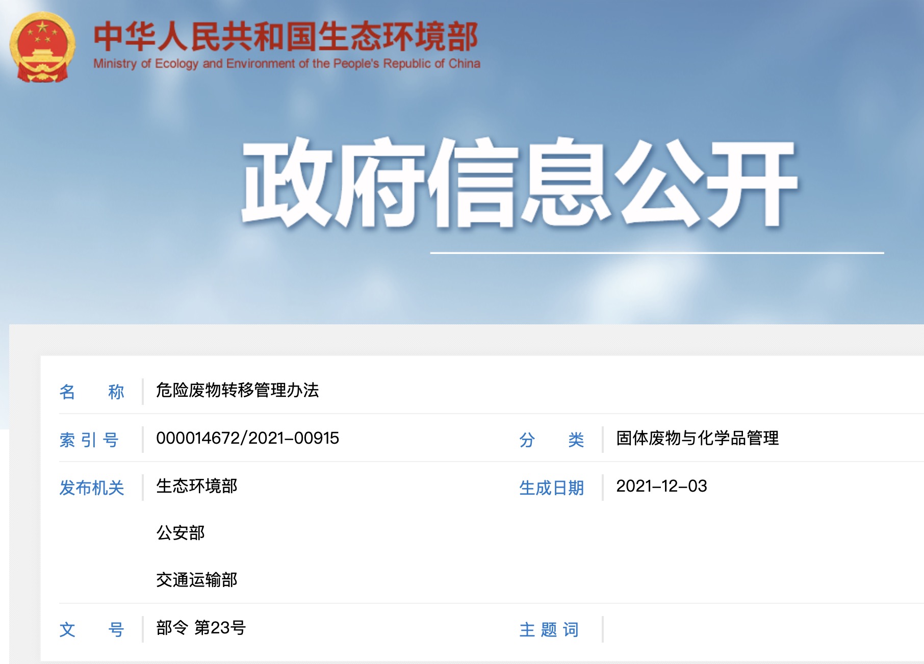 《危險廢物轉(zhuǎn)移管理辦法》已于2021年9月18日由生態(tài)環(huán)境部部務會議審議通過,并經(jīng)公安部和交通運輸部同意,現(xiàn)予公布,自2022年1月1日起施行。