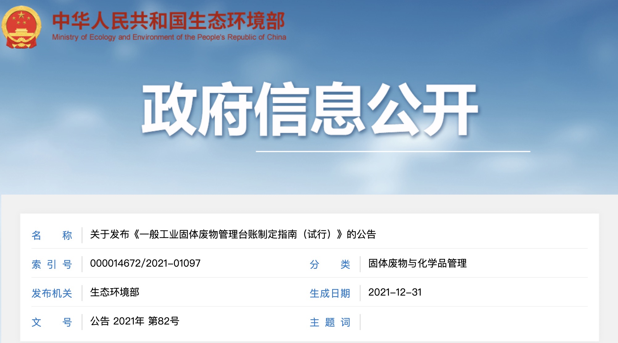 關(guān)于發(fā)布《一般工業(yè)固體廢物管理臺賬制定指南(試行)》的公告為落實《中華人民共和國固體廢物污染環(huán)境防治法》第三十六條關(guān)于建立工業(yè)固體廢物管理臺賬的有關(guān)規(guī)定,指導產(chǎn)...