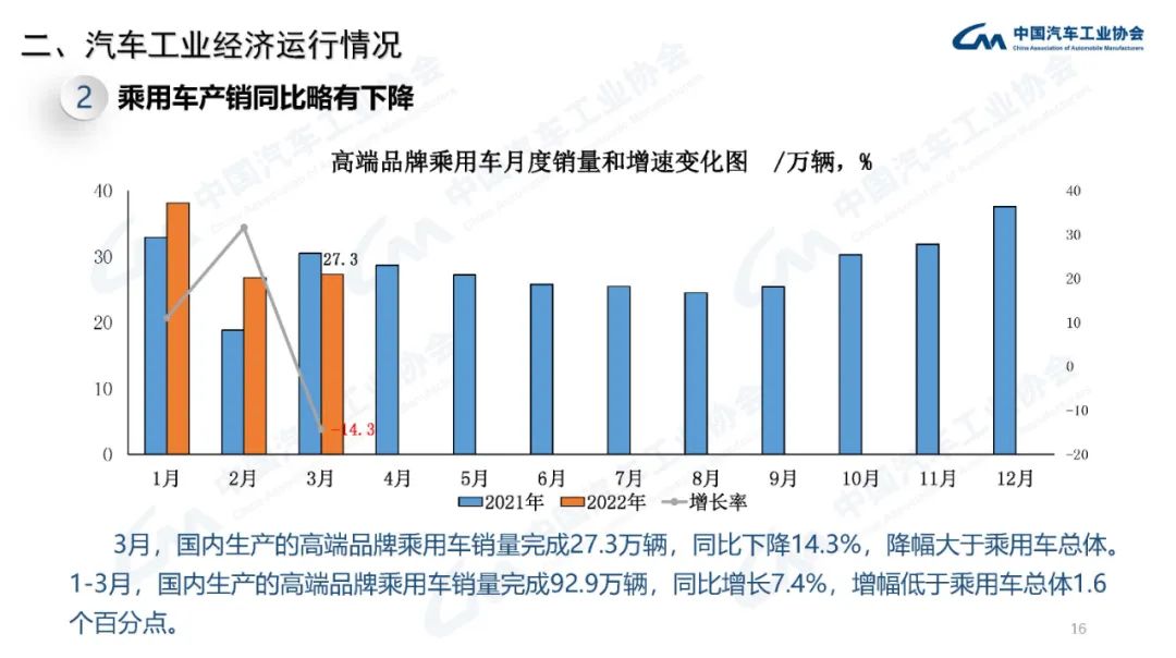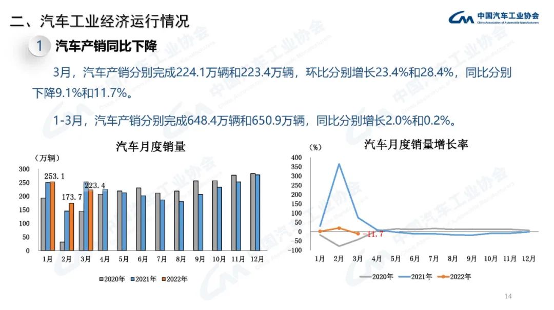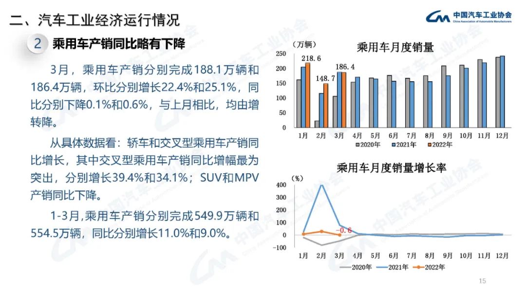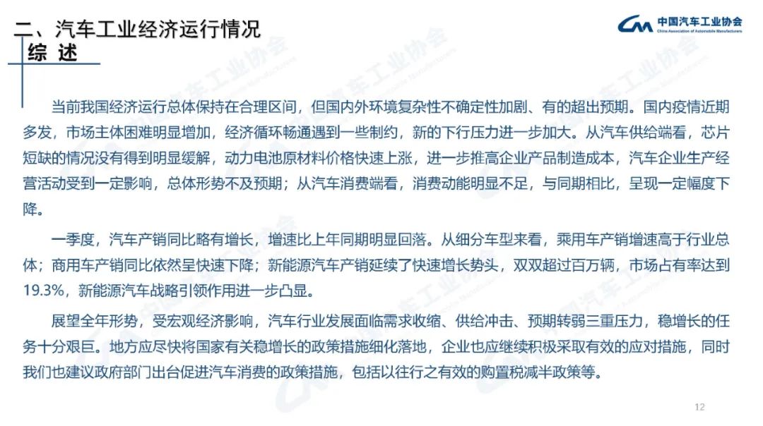 2022年3月,國內(nèi)疫情近期多發(fā),市場主體困難明顯增加,經(jīng)濟循環(huán)暢通遇到一些制約,新的下行壓力進一步加大。從汽車供給端看,芯片短缺的情況沒有得到明顯緩解,動力電池原材料價格快速上漲,進一步推高企業(yè)產(chǎn)品制造成本,汽車企業(yè)生產(chǎn)經(jīng)營活動受到一定影響,總體形勢不及預期;從汽車消費端看,消費動能明顯不足,與同期相比,呈現(xiàn)一定幅度下降。