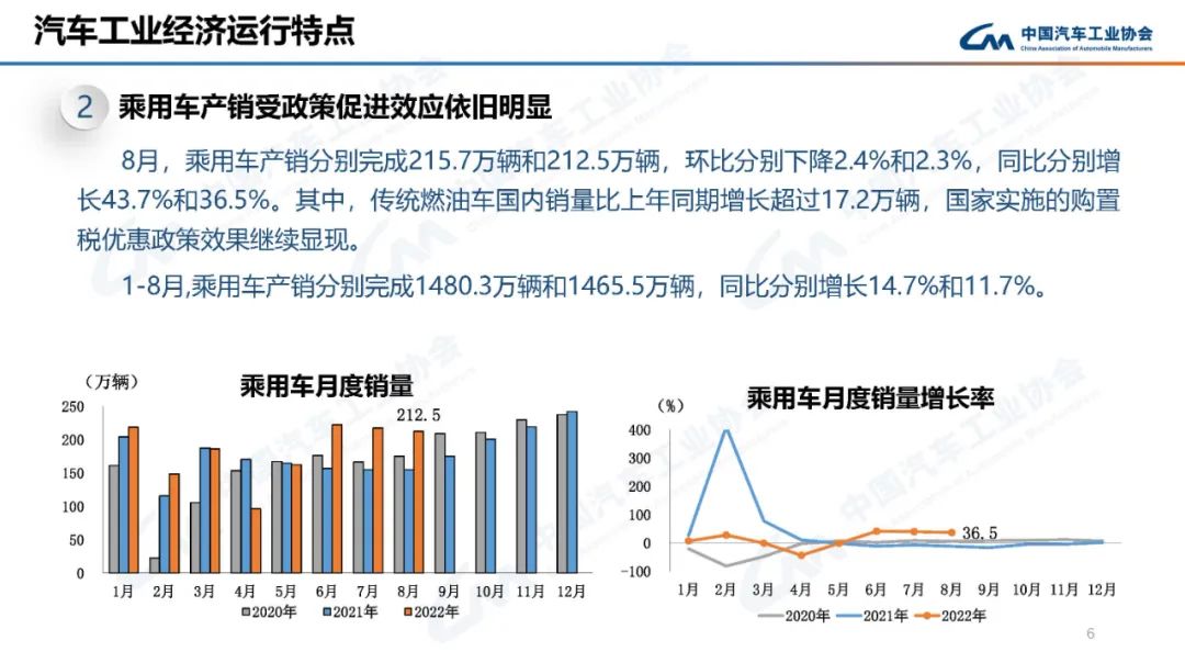 2022年8月,汽車產(chǎn)銷同比延續(xù)保持快速增長勢頭,購置稅優(yōu)惠等促消費(fèi)政策持續(xù)發(fā)力,乘用車消費(fèi)企穩(wěn)上升,即使經(jīng)濟(jì)運(yùn)行有波動(dòng),消費(fèi)依然堅(jiān)韌,已逐步恢復(fù)到正常狀態(tài);商用車產(chǎn)銷實(shí)現(xiàn)今年以來首次同比增長;本月新能源汽車產(chǎn)銷、汽車出口同比均創(chuàng)歷史新高。